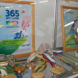 Вниманию клиентов представлены экспонаты спортивной тематики: медали и кубки, дипломы и грамоты, завоеванные сотрудниками а в спортивных соревнованиях, а также фотографии, марки, значки, спортивная одежда и инвентарь.
